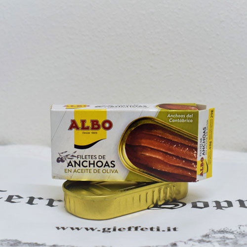 Pregiati filetti di Acciughe del mar Cantabrico. Il Mar Cantabrico, mare aperto e pulito a Nord della Spagna, è famoso per la sua fauna ittica. Le acciughe di questo mare sono diverse da quelle che noi conosciamo per dimensioni, polpa e sapore delle carni. I filetti di Acciughe vengono lavorati a mano con ogni cura prima di essere confezionati, con l’aggiunta del miglior olio di oliva.