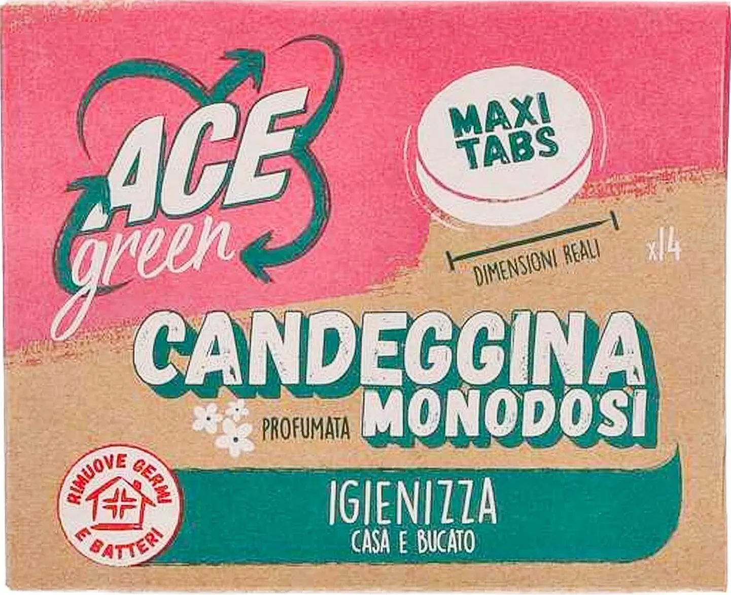 Ace Green è la nuova linea di prodotti realizzati con cartoni e bottiglie 100% riciclati. Ace Green Candeggina Monodosi Tabs è la candeggina monodose a ridotto impatto ambientale. Garantisce pulizia e igienizzazione alla tua casa ed al tuo bucato.