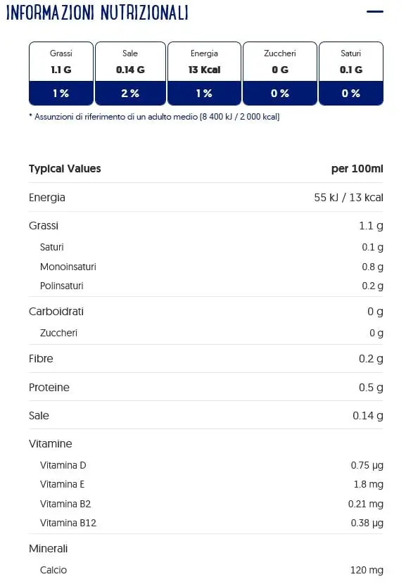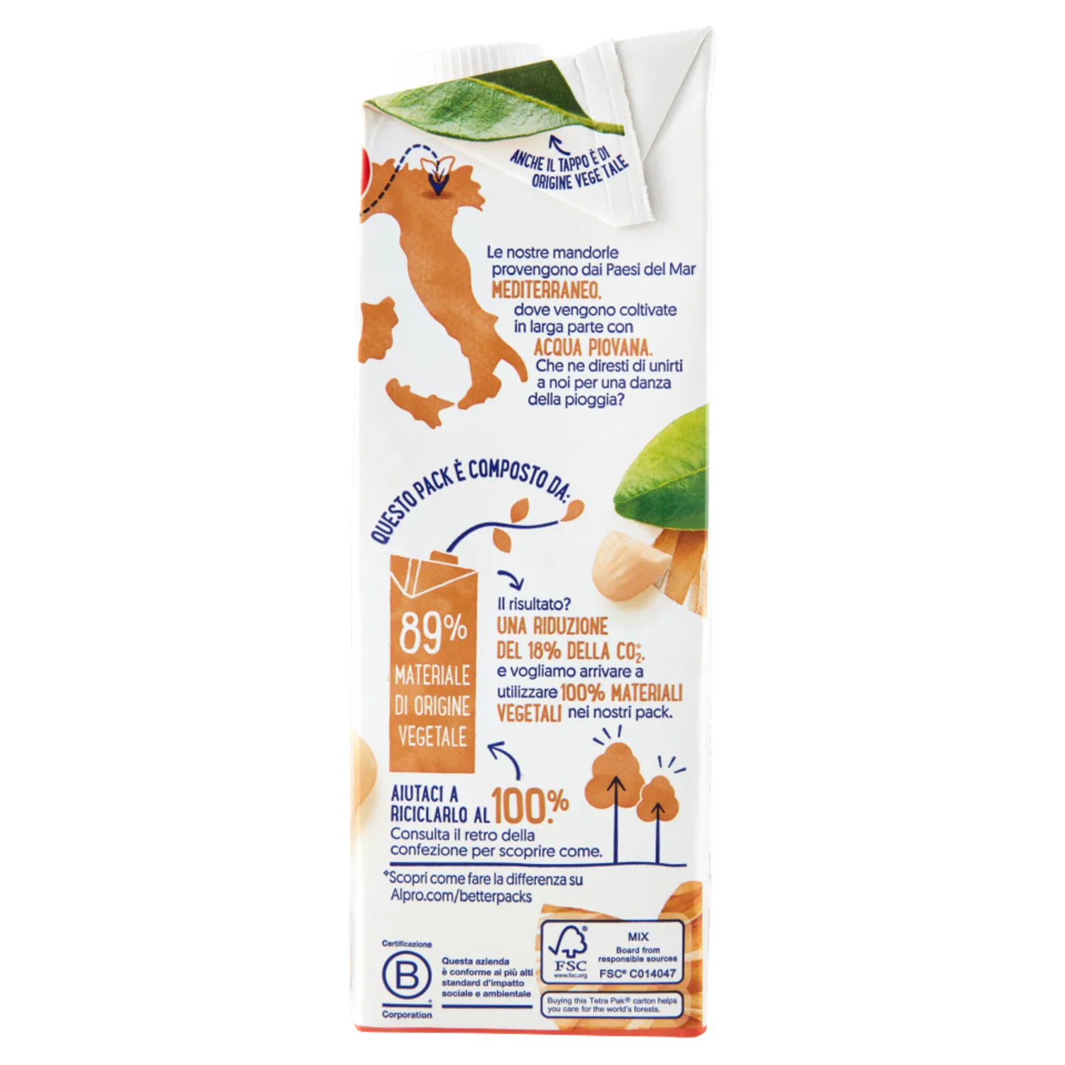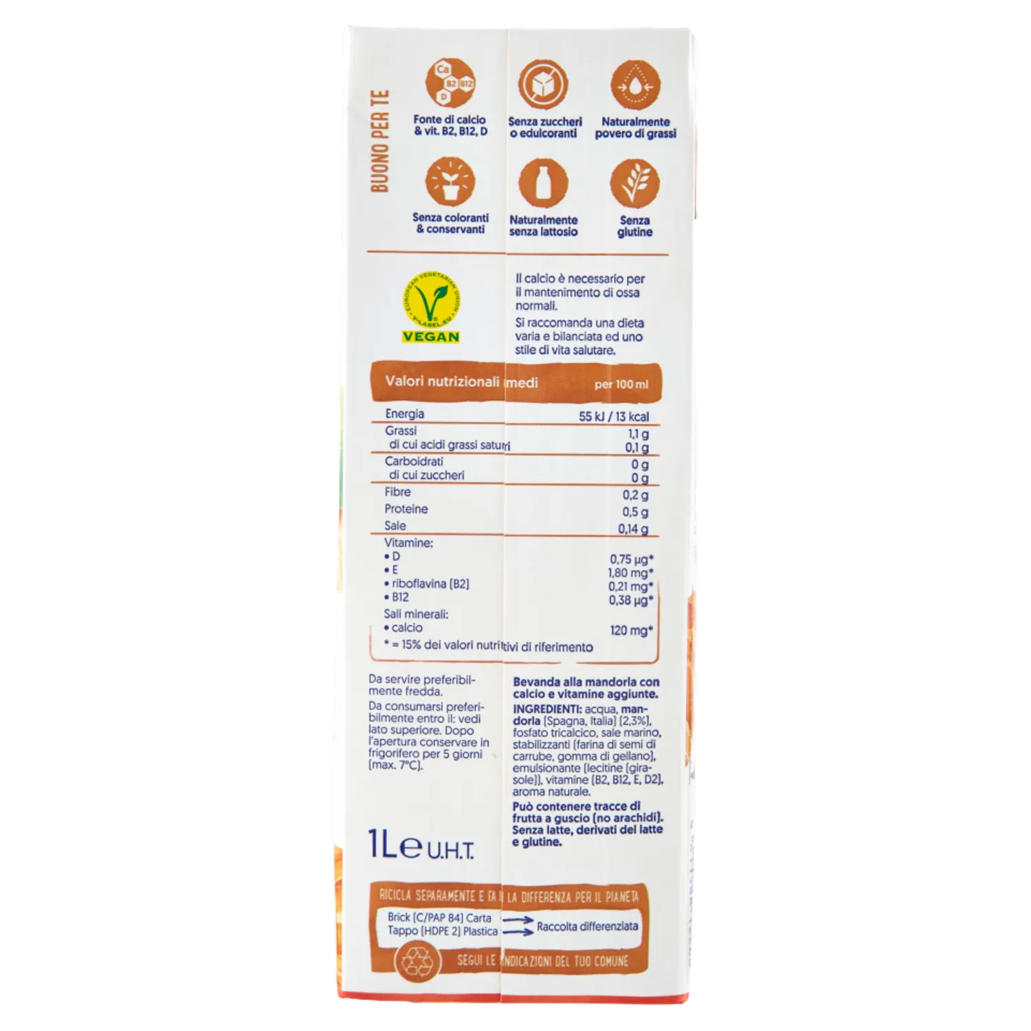 Acqua, mandorla (2,3%), fosfato tricalcico, sale marino, stabilizzanti (farina di semi di carrube, gomma di gellano), emulsionante (lecitine (girasole)), vitamine (B2, B12, E, D2), aroma naturale.