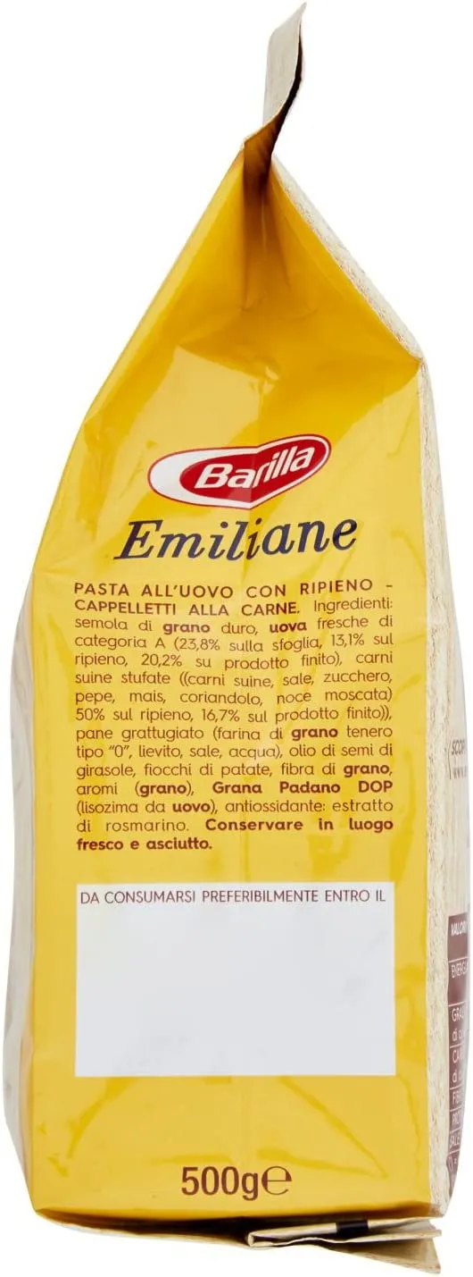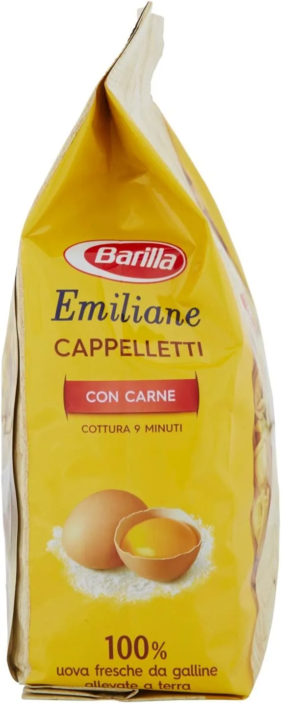 Barilla Le Emiliane Cappelletti alla Carne – 500 g. Solo Ottimi ingredienti, selezionati con cura e avvolti in una delicata sfoglia all’uovo per una pasta ripiena dal gusto unico. Proprio come vuole la vera tradizione emiliana. Con semola di grano duro, uova fresche di provenienza italiana, carni suine e Gran Padano DOP. Barilla è un’azienda italiana di famiglia che coltiva la passione per la pasta dal 1877. I nostri sughi, pasta e cereali sono gustosi, sicuri e contribuiscono a una dieta equilibrata sulla tua tavola.
