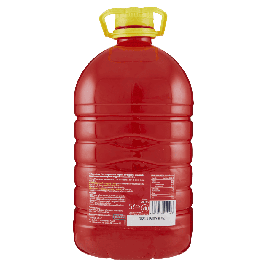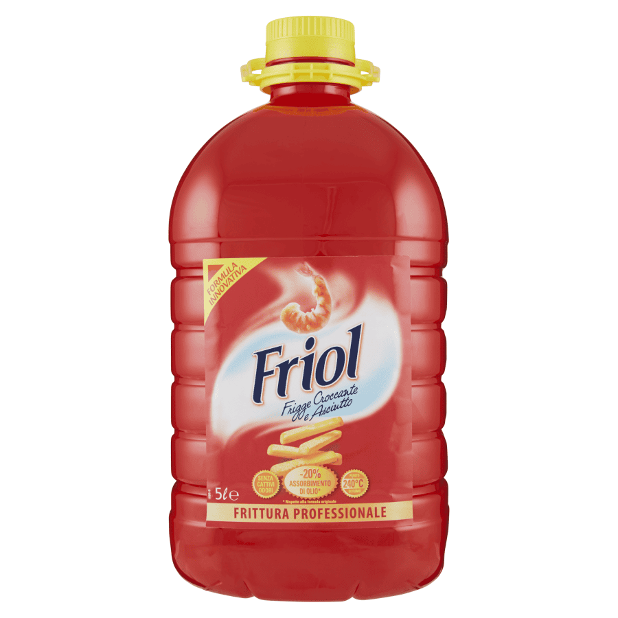 Dall’esperienza Friol, lo specialista degli oli per friggere, un prodotto pensato appositamente per chi frigge elevati quantitativi. Grazie all’innovativa composizione, i cibi assorbono il 20% di olio in meno. Vantaggi: – Una riduzione del costo per frittura perché aumenta la vita utile dell’olio. – Un aumento del punto di fumo fino a 240°C. – L’eliminazione della formazione di cattivi odori. – Una frittura ancora più croccante e asciutta all’esterno, morbida all’interno e più fedele al gusto originario dei cibi.