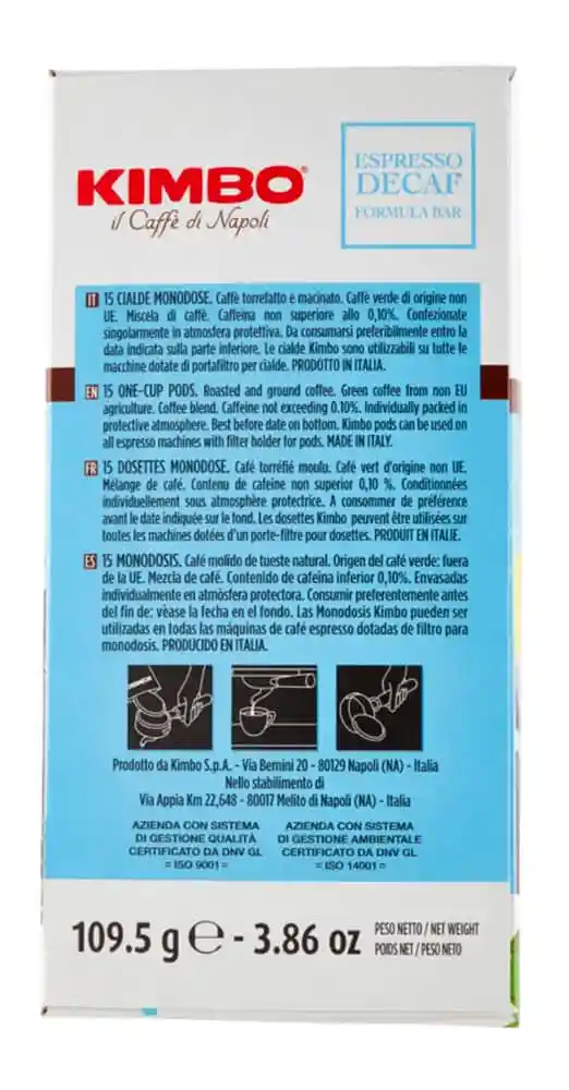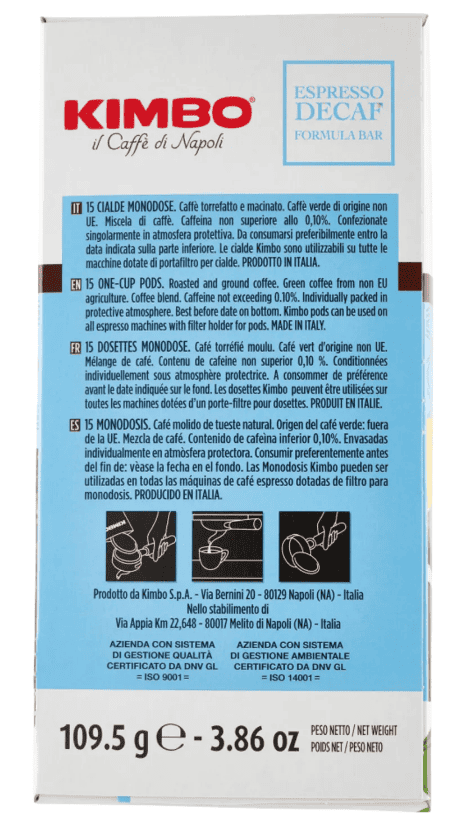 Un avanzato processo di estrazione rimuove la caffeina dalla miscela, lasciando invariate le sue caratteristiche sensoriali. Un caffè in cialde dall’appeal pronunciato e corposo, con un retrogusto persistente, nonostante l’assenza di caffeina. Insomma, KIMBO Decaffeinato è la scelta perfetta per chi vuole un decaffeinato che abbia il carattere intenso e deciso di un caffè classico.