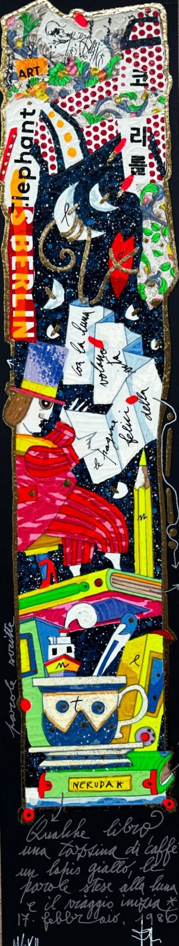 Nelle opere di Francesco Musante, i buffi protagonisti fluttuano in atmosfere surreali, in cui l’esperienza visiva è affiancata da frasi poetiche che talvolta evocano personaggi come Fabrizio de Andrè, Pablo Neruda e Hans Christian Andersen, celebri per le loro composizioni a carattere romantico. Le serigrafie e le opere uniche dell’artista Musante sono spesso arricchite da dettagli polimaterici, collage e glitter, e sono realizzate in numerosi formati. Tra questi ultimi il più diffuso è la serigrafia 8×10 cm, una preziosa carta che rappresenta un determinato soggetto ad esempio il Portafortuna.