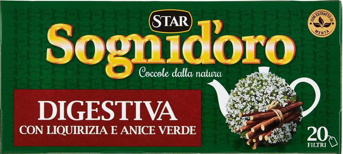 La linea di Tisane Funzionali Sognid’oro è composta da miscele esclusive di erbe ed estratti selezionati per esaltare il gusto delicato e le proprietà benefiche della natura. Con Liquirizia e Anice Verde, che possono facilitare la funzione digestiva, e in più l’Estratto di Menta, un concentrato della pianta.