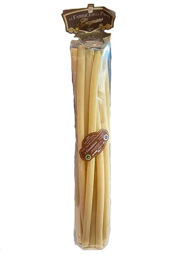 E Candeloni ‘A Metro della Fabbrica della Pasta di Gragnano IGP sono lavorati a mano, realizzati con Semola di grano duro italiano di alta qualità, stirata al bronzo ed essiccata a bassa temperatura, la lavorazione è artigianale ed è curata passo passo, in ogni minimo dettaglio.I Candeloni hanno una forma allungata, cilindrica e sono cavi all’interno, sono simili agli ziti ma di dimensioni maggiori, sono però più stretti dei rigatoni; anche se vengono classificati tra i formati di pasta lunga solitamente per cuocerli si usa spezzarli.In confezione scenografica da circa 50 cm perfetta come idea regalo.
